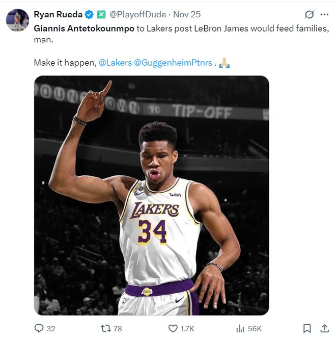 湖人记者Ryan Rueda已经开始畅想扬尼斯未来离队的情况,他写道:扬尼斯加盟湖人队后可以完美取代勒布朗-詹姆斯的位置,将帮助这支球队度过很多难关,伙计们让这一切实现吧。